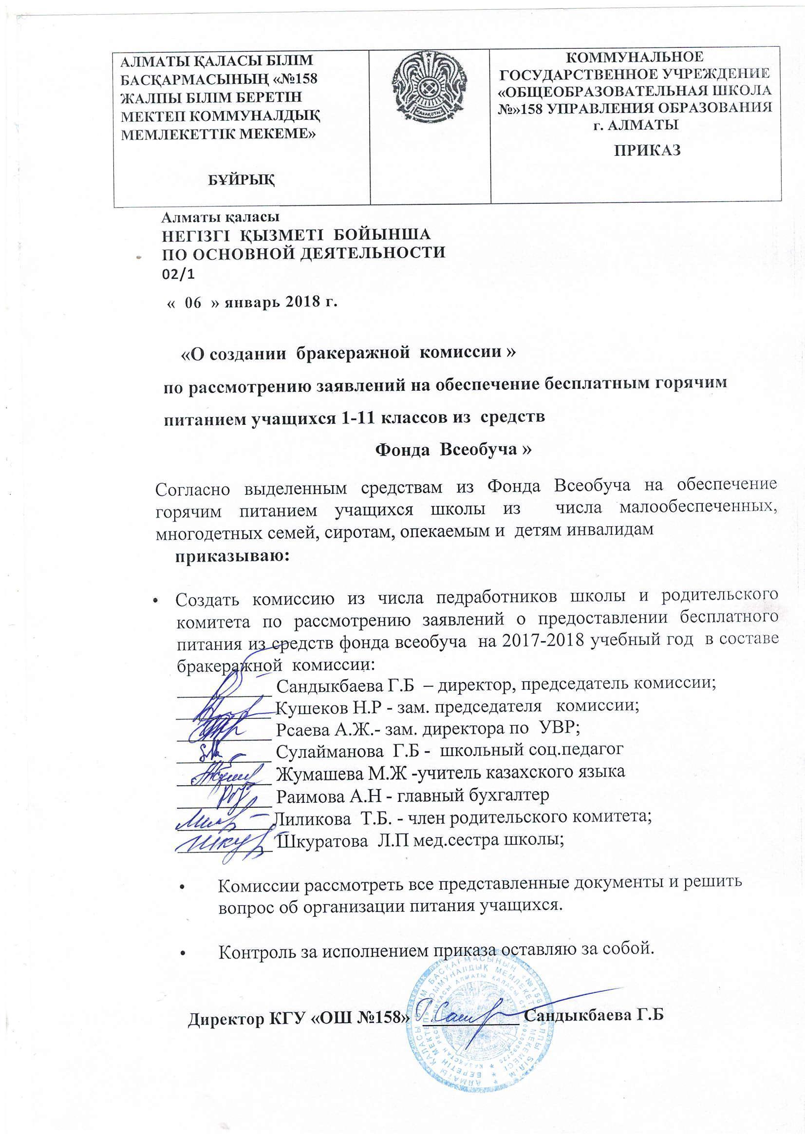 06 қаңтар 2018 0 1 2 3 4 5 Приказ №2/1 О создании бракеражной комиссии Осы беттің QR-коды:QR-код этой страницы: