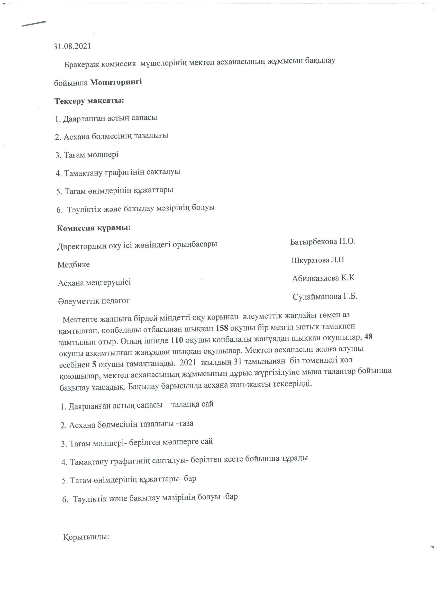 План работы комиссии по контролю качества готовых блюд 2021-2022 учебный год