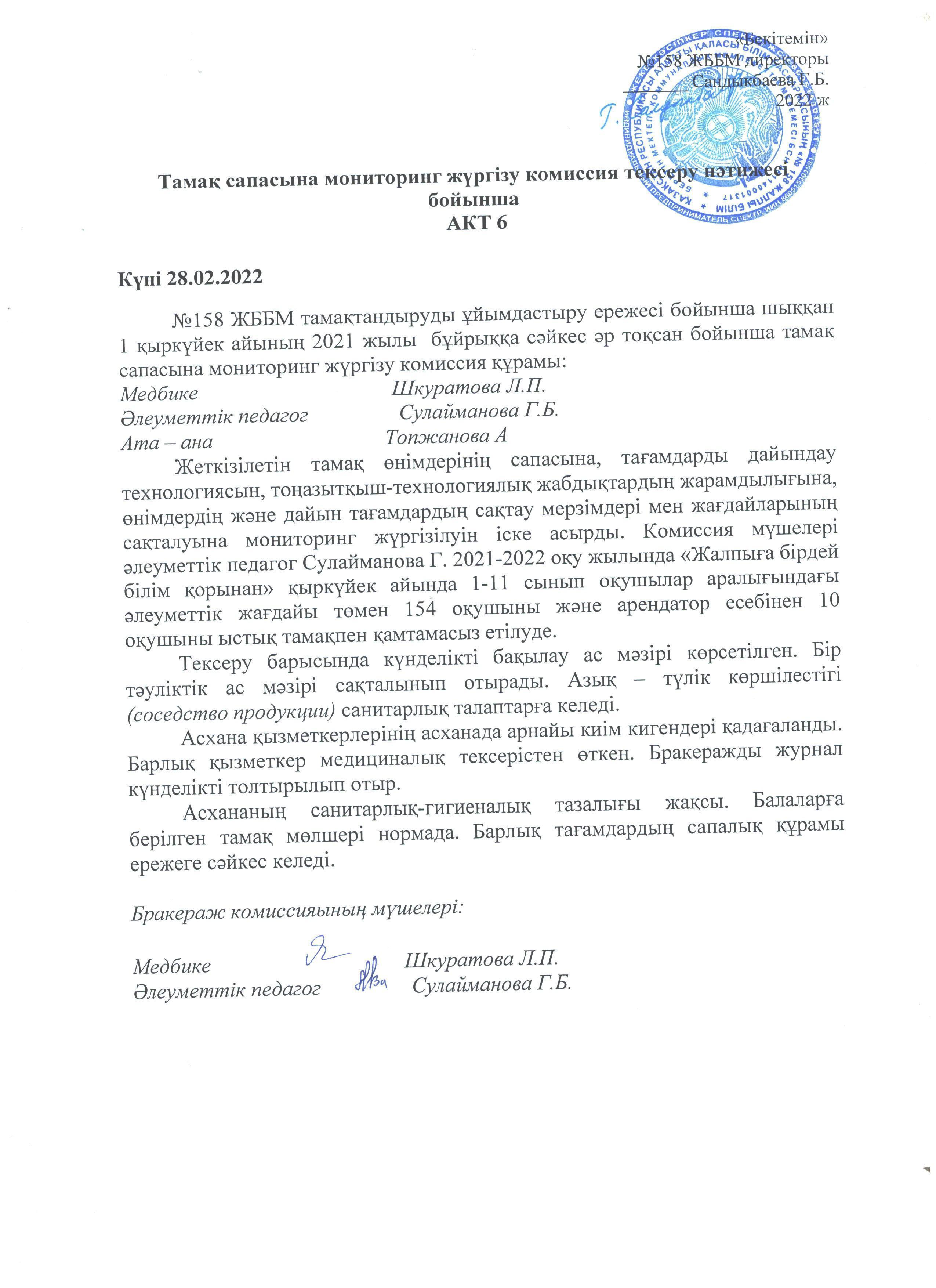 28 ақпан 2022 0 1 2 3 4 5 Тамақ сапасына мониторинг жүргізу комиссиясы тексеру нәтижесі бойынша АКТ №6 Осы беттің QR-коды:QR-код этой страницы: